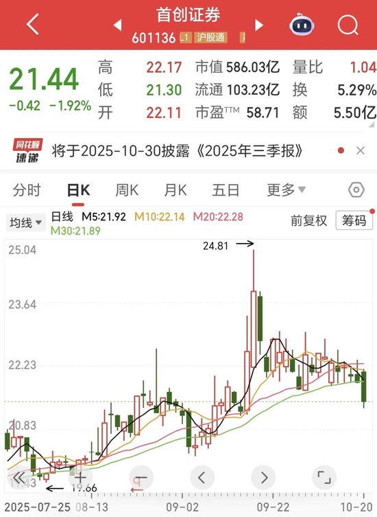 截至10月20日收盘,首创证券报收21.44元/股,市值586.03亿。
